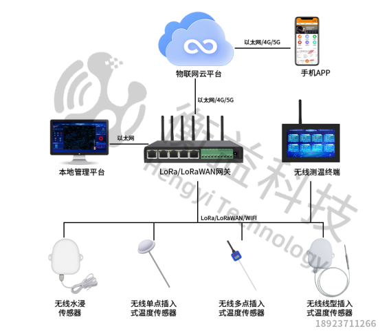 无线测温终端接口丰富,对内支持无线(LoRa/LoRaWAN),有线RS485,I/O,可以连接多种有线无线传感器,可以跟各种不同的传感器组成一个小系统。对外支持4G/5G,RJ45,能把接收到的传感器数据上传到云平台。也可以通过I/O联动外部的控制设备。下面是无线测温终端组成一些系统。